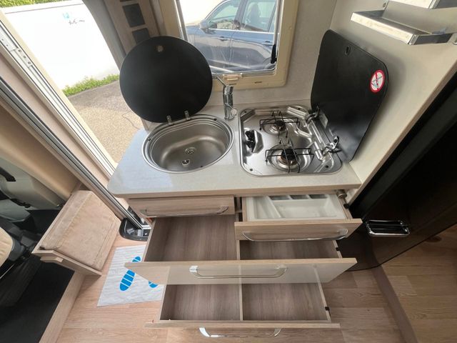 Fiat Ducato 2,3l 6-Gang Schaltgetriebe, Thule Fahrradträger am Heck, Rückfahrkamera, Markise Thule Omnistor, elektr. Queensbett 192 x 140 cm, 2x AGM Batterie, Solaranlage 240W inkl. Solarregler, Duo Control, Dometic Absorber Kühlschrank, Feuerlöscher, Abzugshaube in der Küche, Wechselrichter, Cytrac SAT-Anlage, Pioneer DAB + CD Multimedia