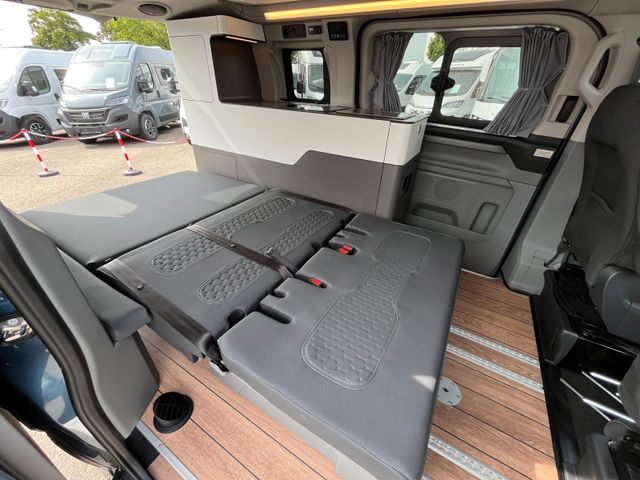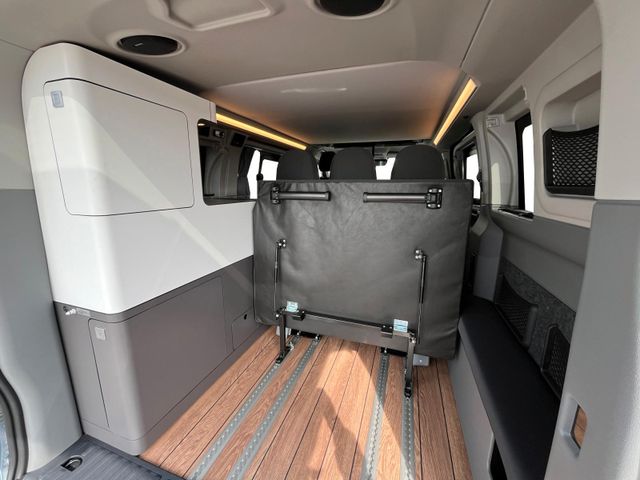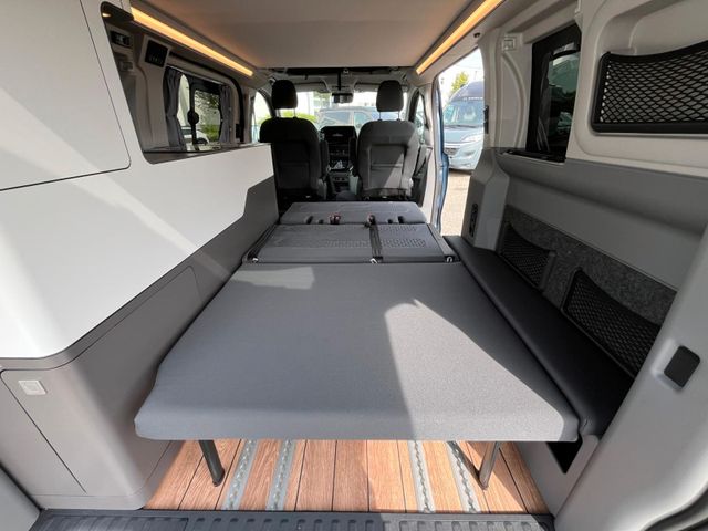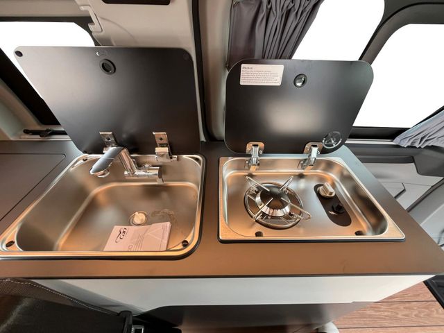 Serienmäßiges Aufstelldach mit integrierter Dachträger Reling, 4 Schlafplätze, Einfacher Bettumbau der Sitzgruppe, Beidseitiger Zugang dank, Doppelschiebetüre, Funktioneller Küchenblock, von innen und außen bedienbar, Tragbare Kühlbox, Gaskocher, Mobiliar URBAN, Polstervariante JAVA