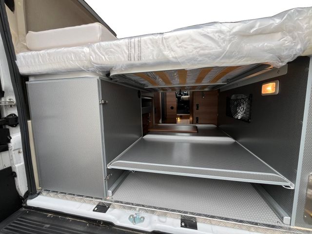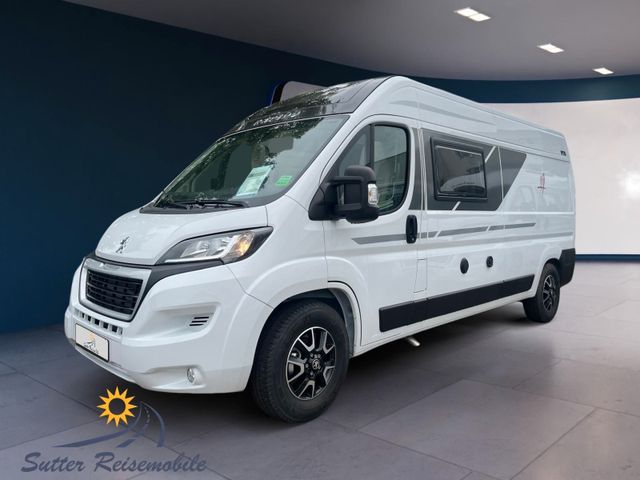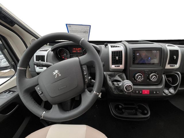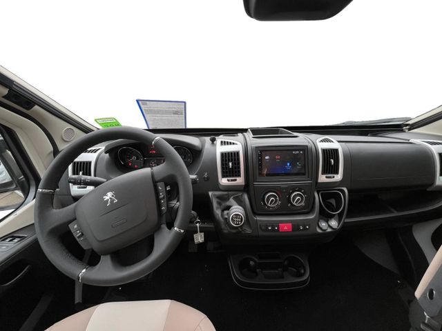 Schlafzimmer, Feststehendes Bett mit Aluminiumrahmen, mehrschichtigen aktiven Holzlatten und hochbelastbarer BULTEX®-Schaumstoff-Matratze, Matratzenbezug beim feststehenden Bett aus hochwertigem Stretch-Gewebe, Lautsprecher im Schlafzimmer, Staufach über der Hecktür, Fahrzeugausstattung, Trägerfahrzeug PEUGEOT BOXER 2,2 L BlueHDI 140 PS, 4 zugelassene Sitzplätze, ABS, Traction+ mit Hill Descent Control (hilft, beim Bergabfahren, die gewünschte Geschwindigkeit beizubehalten), Fahrer- und Beifahrerairbags, Heizbare elektrische Außenspiegel, Zentralverriegelung der Fahrerhaus- und Seitentüren mit Fernbedienung, Tempomat, Stop & Start, Fahrerhausausstattung, Unabhängiges Autoradio, Teppichboden im Fahrerhaus, TOUCH Lese-Spot im Fahrerhaus, Lenkrad und Schalthebelgriff in Leder, Stickerei auf den Kopfstützen der Fahrerhaussitze