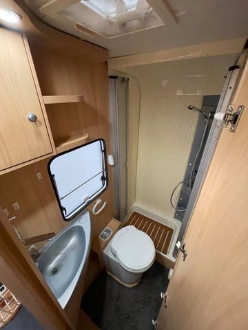 Bad mit Banktoilette und integriertem Duschraum, Cassettentoilette mit elektrischer Pumpe und