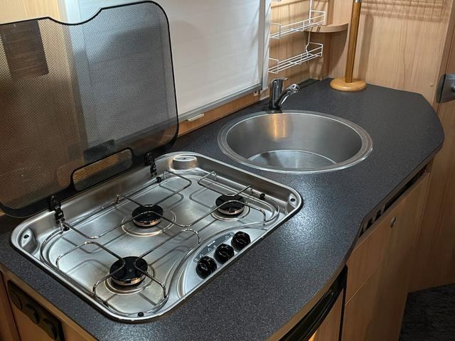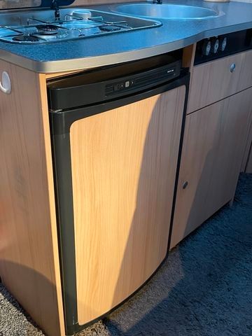 im Küchenblock, Großes Rundspülbecken aus Edelstahl, Wassertank inkl. Boiler 122 l, Abwassertank 92 l, Abfalleimer, Kühlschrank.