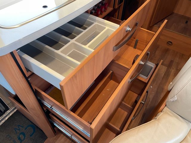 Vollintegrierter Aufbau, Doppelbett, ABS, Fahrer- & Beifahrerairbag, Automatik-Klimaanlage, Tempomat, Markise, Navigation, 2-DIN Radio inkl. Rückfahrkamera, Rückfahrkamera, Fliegengittertür, Reserverad, Solaranlage 2 × 100 Watt, Lithiumbatterie 100 Ah, Gastank fest eingebaut (14 kg), Gas-Backofen