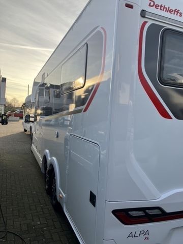 Fiat Ducato Maxi ALKO Tiefrahmen 3-Achser (5.000 kg) MultiJet 180 (2,2 l / 132 kW / 180 PS) Heavy Duty, 8-Gang Wandler-Automatikgetriebe, 95 Jahre-Paket A 7820-2 (Light Moments: Indirekte Ambientebeleuchtung über den Dachstauschränken, Verdunklungsjalousien im Fahrerhaus, Dunstabzugshaube (Abluft) mit Zugluft-Stopper, Stützen (2 Stk.) für Anbau hinten, Automatische Gasflaschenumschaltung inkl. Crash Sensor und EisEx, Rückfahrkamera (Einfachkamera), Panoramafenster (zweite Panoramadachhaube 75x105 cm längs über Sitzgruppe Heck) inkl. Baldachin und Raumleuchte, Zentralverriegelung für Fahrerhaus-, Wohnraumtüre und Garagentüren, Styling-Paket (Alkovenaufsatz), Panorama-Dachhaube 70 x 50 cm im Alkoven, Außendesign GT (Heckleuchtenträger mit schwarzem Diffusor, Skidplate "rot"), Hoher charakteristischer Dethleffs Exklusiv Heckleuchtenträger mit ShapeLine LED Rückleuchten und 3. Bremsleuchte, Light Moments: Indirekte Wandflächen-Ambientebeleuchtung, Light Moments: Indirekte Beleuchtung im Badezimmer mit beleuchteter Duschkonsole, Light Moments: Beleuchtete Garderobe, Light Moments: Sockelbeleuchtung in der Küche, Victron PowerAssist und PowerControl, Elektroblock EBL 102, Victron Bedienpaneel über der Aufbautür, Victron Energy MultiPlus Lade-/Wechselrichterkombination 1600W/70A, 168 Ah Lithium Batterie, Automatische SAT Anlage 85 Twin mit 32" TV (inkl. Halter) inkl. Soundboard, Kühlschrank (177 l), Türe beidseitig zu öffnen mit integriertem Backofen, Wärmetauscher für Warmwasserheizung, Dethleffs Naviceiver inkl. DAB+, Truck Navigation, Wireless Apple CarPlay und Android Auto, Cassettenmarkise Omnistor 6,0 m (elektrisch), Gurtbank inkl. zwei 3-Punkt-Gurte entgegen der Fahrtrichtung inkl. Bettenbau Sitzgruppe, Auflastung auf 5.400 kg), Wohnwelt Samir, Warmwasser-Teppich für das Fahrerhaus, Alkovenbett elektrisch beheizt