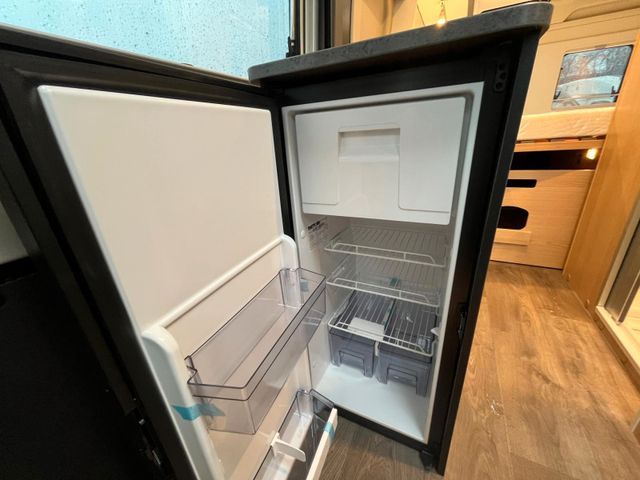 Ergonomisch angeordnete Küche mit großzügiger Arbeitsfläche, Geräumige Schublade mit Servo-Soft im Küchenblock, Flex-Schienensystem mit 2 Haken, 2-Flamm Gaskocher mit elektrischer Zündung und Glasabdeckung, Abstellfläche hinter Kocher, Wassertank 100 l, Abwassertank 90 l, Kompressorkühlschrank 84 l, LED-Lichtröhre
