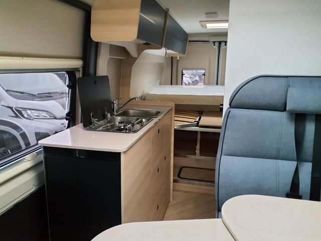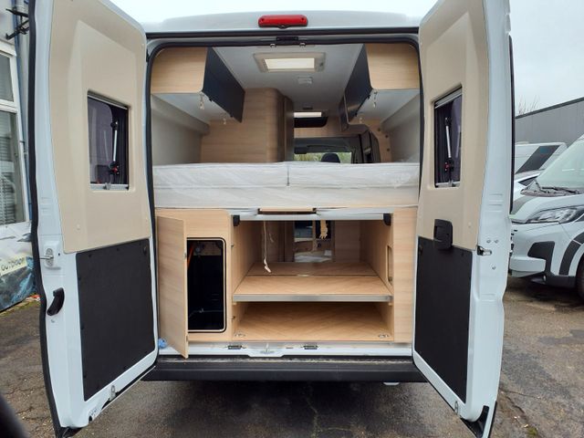 Verdunkelungsplissees in der Fahrerkabine, Fliegengitter an der Schiebetür, Innenverkleidung mit Fenster an den Hecktüren, LED-Außenleuchte, Passende Sitzbezüge