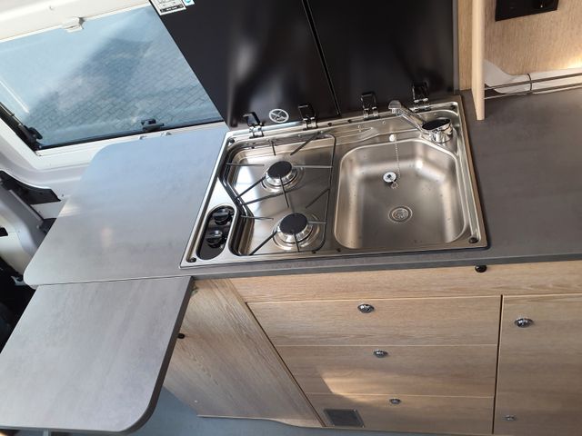 Küche: Hochwertige Arbeitsplatte mit robuster Oberfläche, Kühlschrank mit integriertem und herausnehmbarem Frosterfach, 2-Flammkocher mit Piezozünder und Glasabdeckung für zusätzliche Abstellfläche und Spritzschutz, Edelstahlspüle mit Glasabdeckung