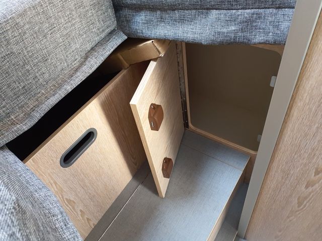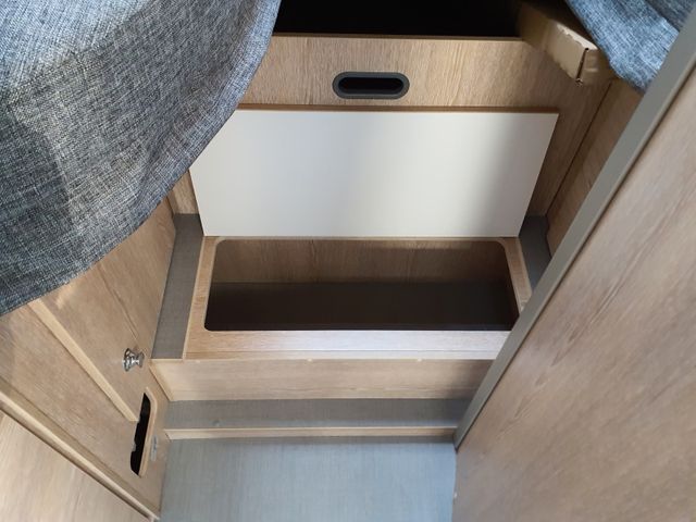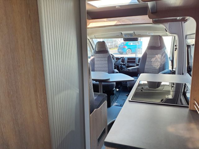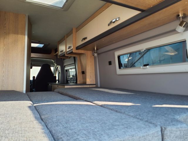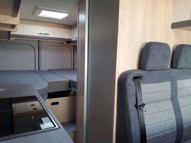 Aufbau: Einstiegsbeleuchtung, Integrierte Rahmenfenster, Fliegenschutz-Schiebetür, Alle Fenster mit Fliegengitterrollo, Verdunklungsplissée und Aufsteller, Optimierte Mehrschicht-Dachisolierung, Optimierte Bodenisolierung mit geschlossen-zelligem Schaum (RTM-Schaum), Wandisolierung mit flexiblen Isoliermatten (PE-Schaum), Mini und Midi Hekis mit GFK-Adapter verbaut für optimale Passform und Dichtigkeit, Zusätzliches Bodenstaufach bei Sitzgruppe, Befestigungsmöglichkeit in der Heckgarage