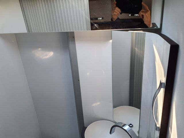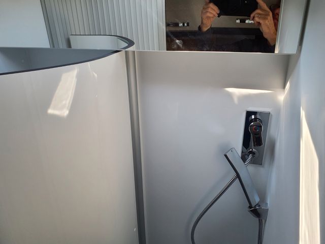 Bad: Handbrause in Chromoptik, Einhebelmischarmatur mit hochwertiger Keramikabdichtung, Variable Schwenkwand für optimale Platzausnutzung, Schwenktoilette für mehr Bequemlichkeit und Keramik-Inlay für einfaches Reinigen, Spiegel mit indirekter Beleuchtung und zusätzlichem Leuchtpanel in der Dusche (nur 540er)