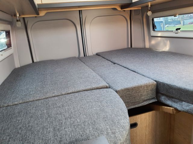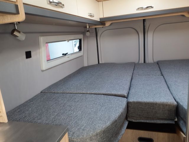 Schlafen: Heckbetten mit großzügiger Liegefläche, Vergrößerung der Heckgarage durch stapelbare Heckbetten, Zusätzliche Staufächer unter den Heckbetten, Heckbereich ausgebaut mit rundumlaufenden Dachstauschränken