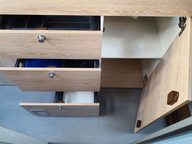 Wohnraum: Wohnraummöbel mit pflegeleichten Oberflächen, Fahrerhaussitze komplett in die Wohnsitzgruppe integrierbar, Beschläge und Auszüge in massiver Metallausführung in Haushaltsqualität, Große Dachschränke bieten viel Stauraum, Möbelbau aus hochwertiger Manufaktur