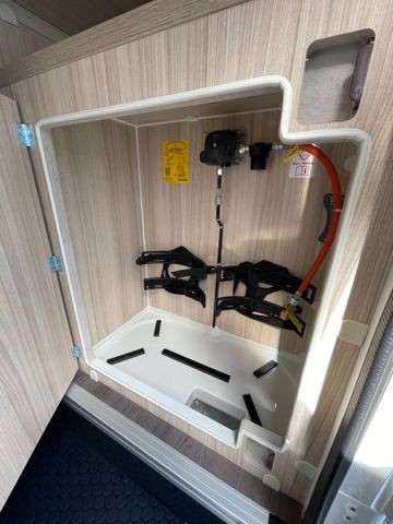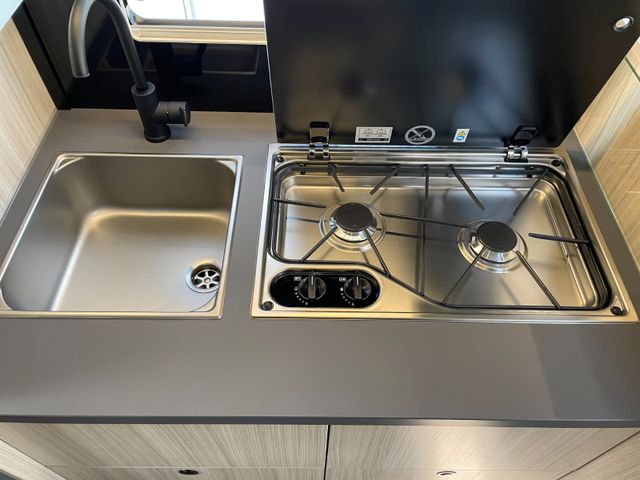 Ausstattung:, Basisfahrzeug Ford Transit 2.0 EcoBlue 130, Schaltgetriebe, Nebelscheinwerfer, elektrische Parkbremse, Notbremsassistent, Verkehrszeichenerkennung, Einparkhilfe vorne, Spurhalteassistent, Reifendruckkontrollsystem, Markise, Solar-Anlage, 12'' Audiosystem SYNC IV mit 5G modem, Rückfahrkamera, 16'' Alufelgen, Lederlenkrad, Eingangstür mit Fenster und Moskitonetz, Isofix-Kindersitz-Befestigung, Edelstahlkocher mit elektrischer Zündung, manuelle Klimaanlage, Tempomat und Geschwindigkeitsregler, Außenspiegel elektrisch und beheizbar, 70 Liter Kraftstofftank, Fahrerhausverdunklung Plissee, Sicherheitsgasregler MonoControl CS + Gasfilter, Ganzjahresreifen mit Schneeflockensymbol, Radiovorbereitung, Tablet- und Getränkehalter, Zentralverriegelung inkl. Aufbautür, Panorama Dachfenster Front, Ladebooster, 100 Ah AGM-Batterie, Kassettentoilette, Truma Combi 4, Truma CP Plus, Frischwassertank 100 l, Abwassertank 88 l mit elektrischem Ablassventil, großer Kühlschrank mit 155 l Inhalt